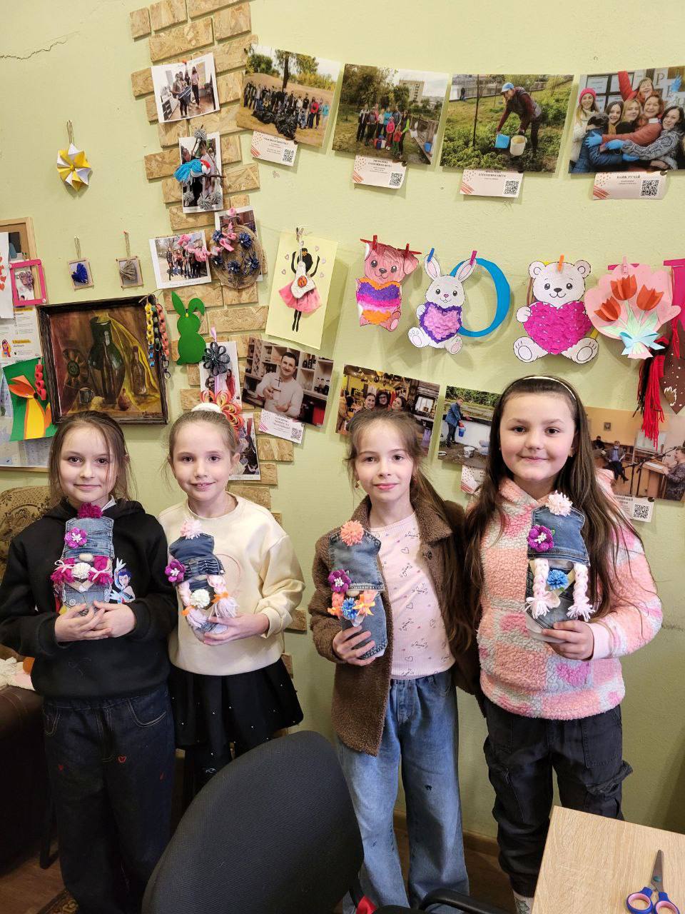 Цього разу творчий процес перетворився на справжній апсайклінг-проєкт! Використовуючи джинсову тканину, яскраву пряжу та тендітні квіти, діти створювали унікальні інтер’єрні ляльки — образи чарівної «Дівчини Весни».