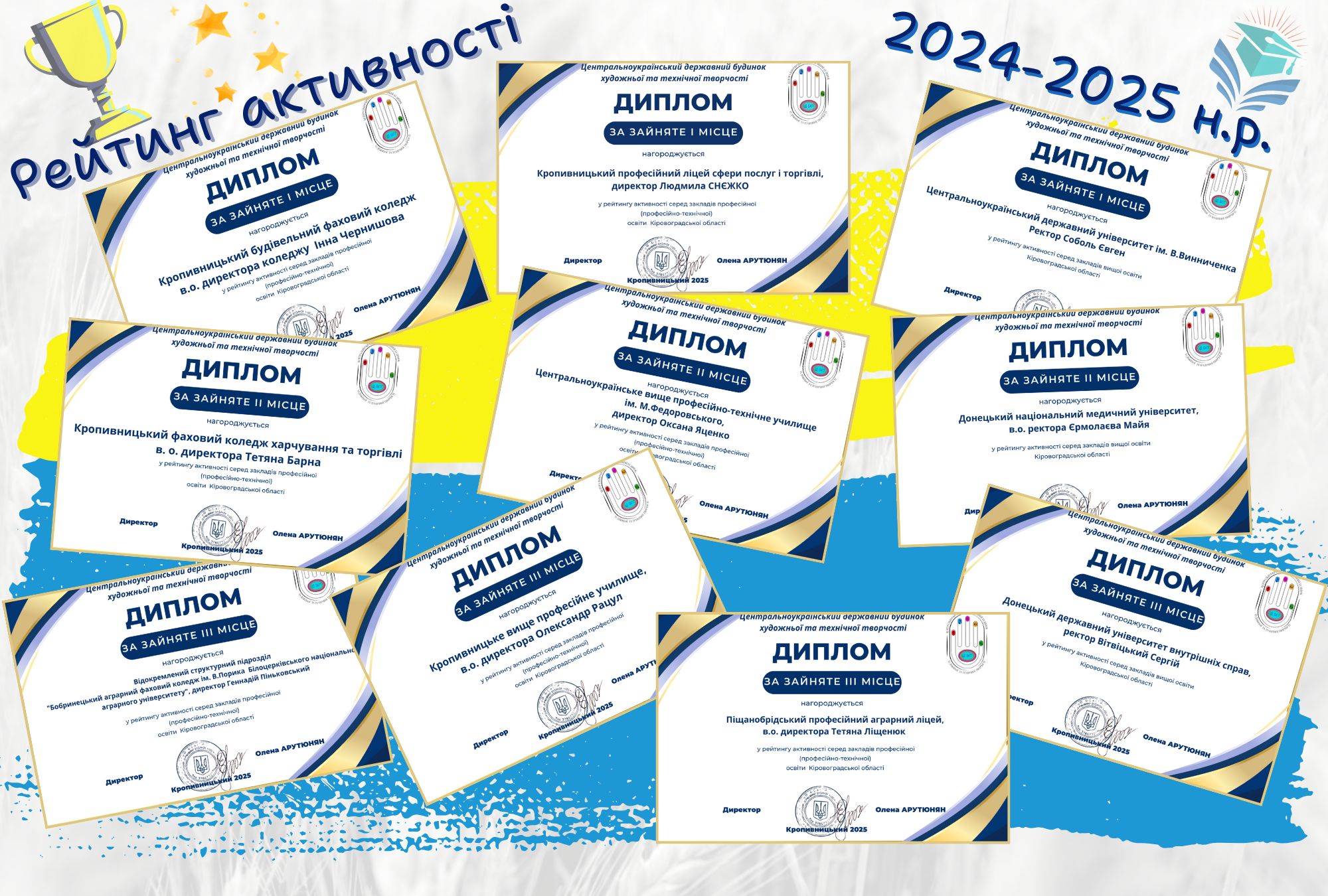 За результатами рейтингу 2024-2025 н.р. у сфері позашкільної діяльності найактивніші заклади освіти були відзначені та нагороджені Дипломами – це яскраве свідчення високого рівня вашої роботи та творчого потенціалу!